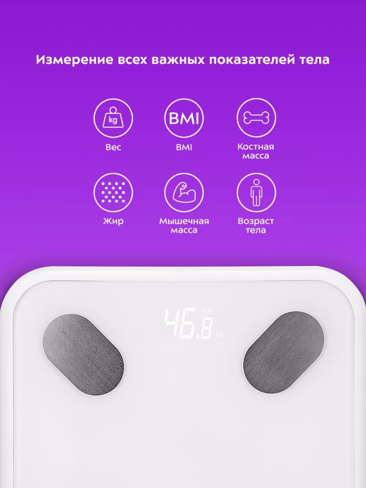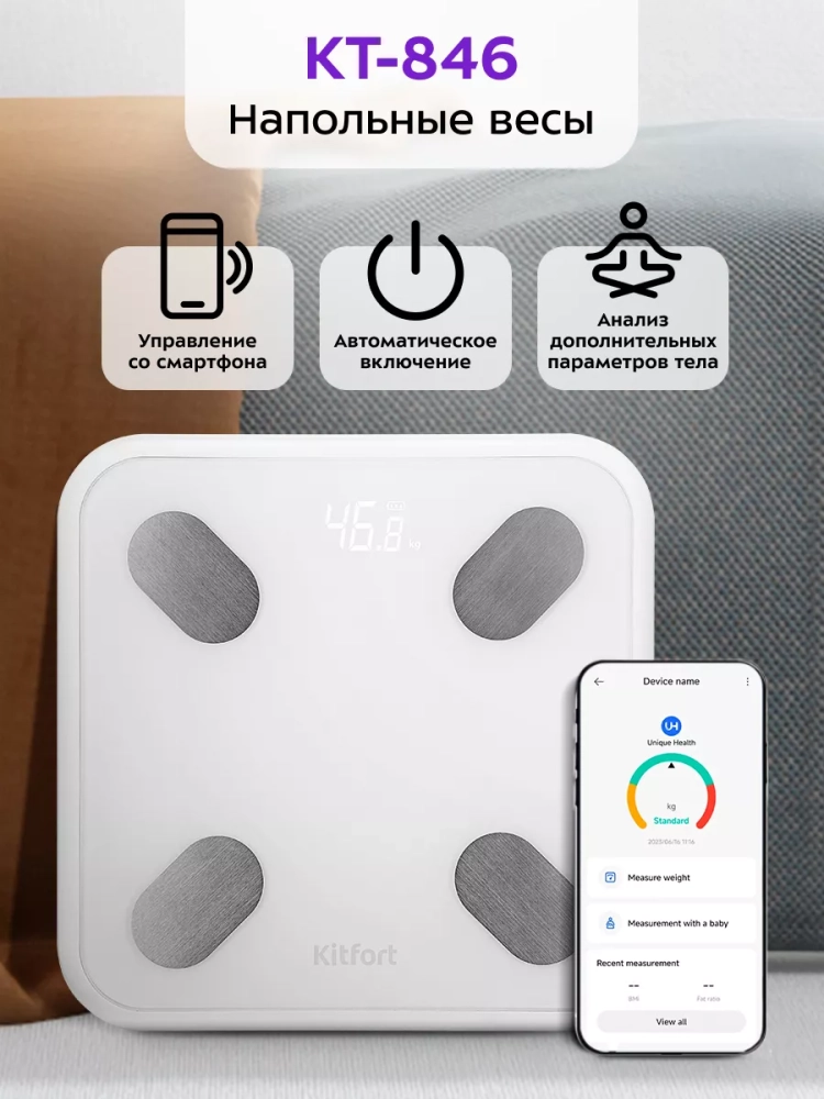 Электронные напольные весы обеспечивают высокую точность измерения, что очень важно людям, следящим за своим весом. Весы Kitfort КТ-846 представляют современное поколение «умных» весов, поскольку их можно подключить к приложению OKOK International, включив передачу данных через Bluetooth. Приложение выводит на экран телефона разные параметры биоимпедансного анализа: индекс массы тела, мышечную массу, процентное содержание воды и жира в организме и т.д.