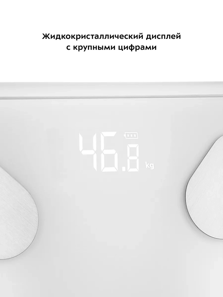 Весы оснащены жидкокристаллическим дисплеем с крупным отображением цифр, что делает их использование максимально удобным. На дисплее попеременно отображаются индикатор заряда батареек и вес пользователя или температура в помещении. Платформа выполнена из высокопрочного полированного стекла, а прорезиненные ножки обеспечивают дополнительную устойчивость весам и предотвращают их скольжение по полу, что гарантирует безопасность во время взвешивания. Токопроводящие электроды встроены в платформу, они необходимы для проведения биоимпедансного анализа.