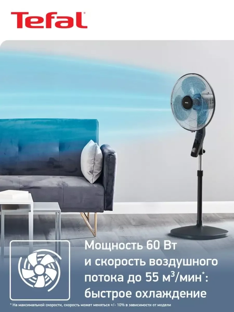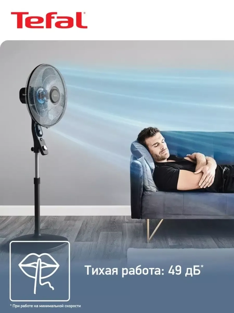 Устройство создает мощный поток воздуха до 55 м3/мин и за мгновение наполняет пространство свежестью. Индивидуально для каждой комнаты вы можете регулировать скорость воздушного потока с помощью 3 оптимальных режимов. Уровень шума большого домашнего вентилятора Тефаль достигает всего лишь 49 дБ, что совершенно не помешает вам во время просмотра телевизора, работы или семейных встреч.