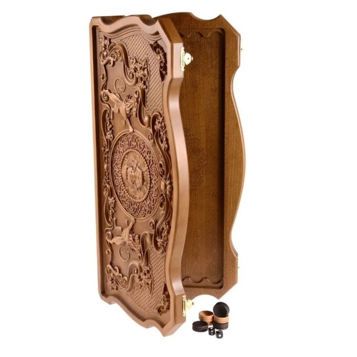 Эти нарды изготовлены из массива бука. Лицевая сторона украшена обильной резьбой.