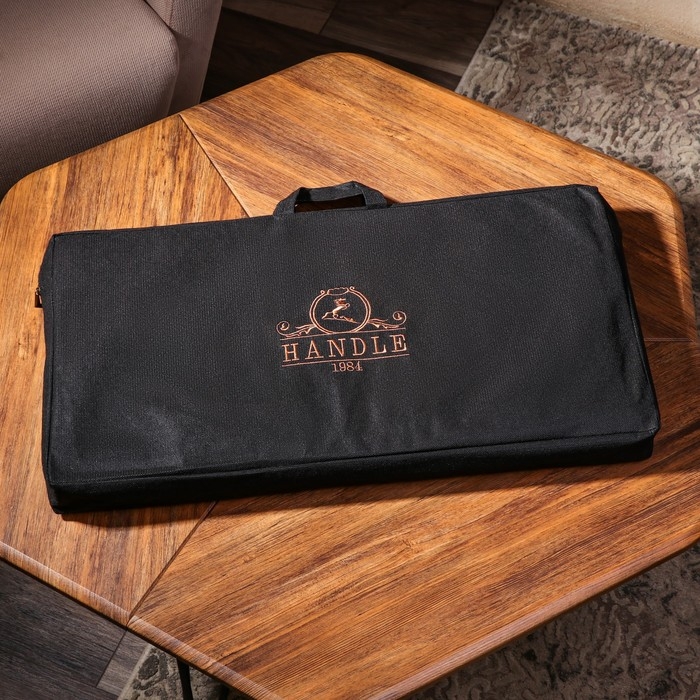 С внутренней стороны доска полностью оформлена под поле для игры в нарды. Фишки вырезаны в ручную, и имеют тканное основание для легкого скольжения по полю.