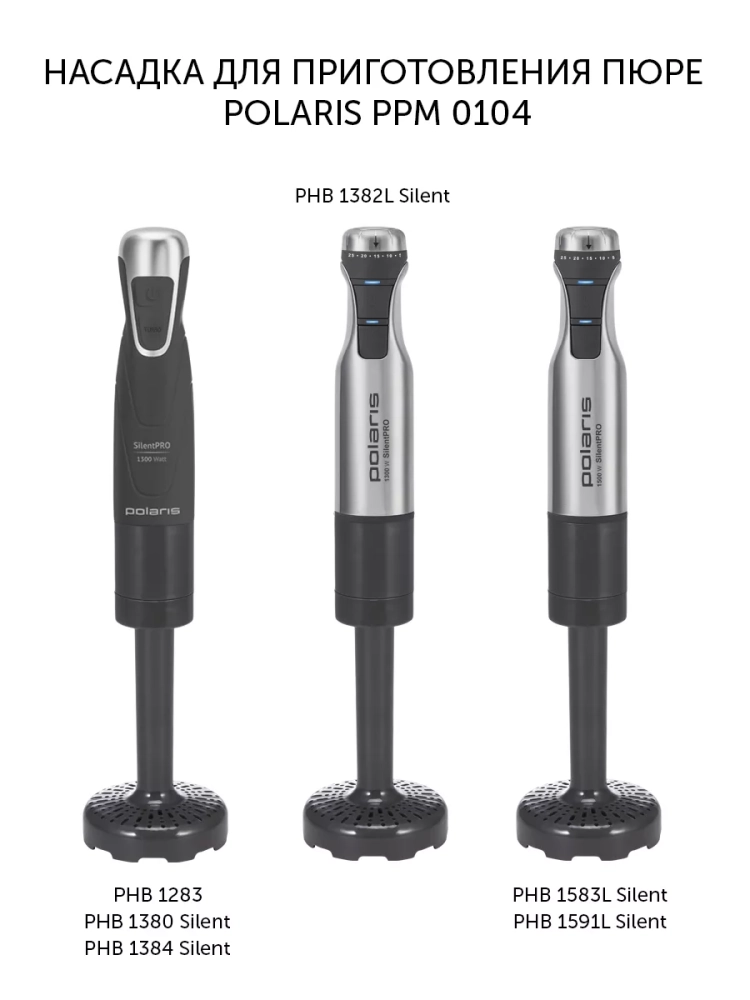 Насадка для приготовления пюре подходит для блендеров POLARIS: PHB 1278, PHB 1283, PHB 1379 Silent, PHB 1380 Silent, PHB 1382L Silent, PHB 1384 Silent, PHB 1476, PHB 1487, PHB 1594, PHB 1583L Silent, PHB 1591L Silent, PHB 1510GL Silent, PHB 1517GL Silent. Идеальна для приготовления воздушного картофельного пюре, также подходит для приготовления нежнейшего пюре из других вареных овощей и детского питания. /p