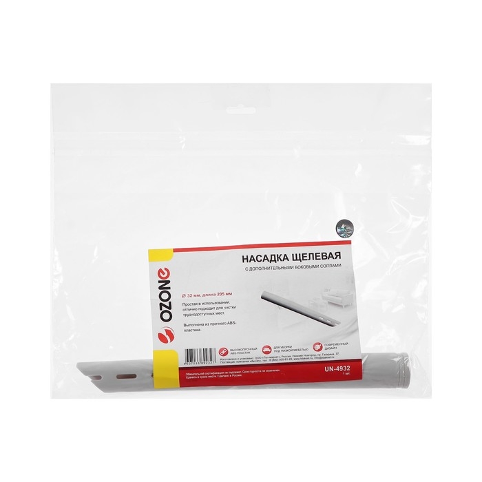 Насадка для пылесоса UN-4932 Ozone - это щелевая насадка с дополнительными боковыми соплами, предназначенная для уборки в труднодоступных местах. Она имеет длину 205 мм и подходит для трубки пылесоса с диаметром 32 мм.
