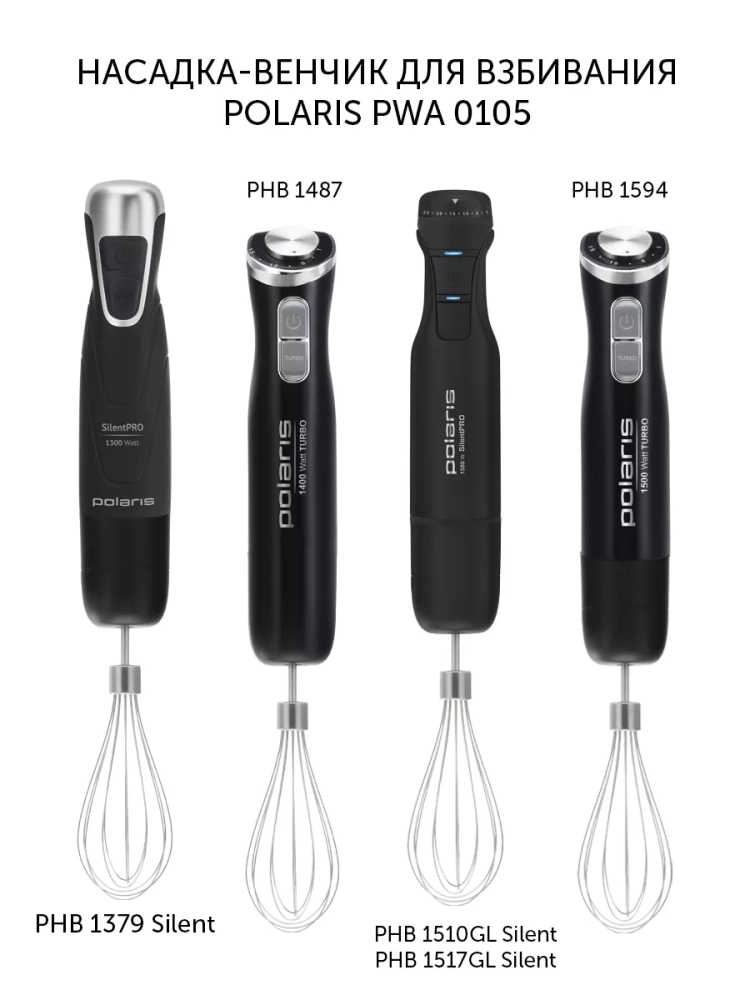 Насадка-венчик для взбивания подходит для блендеров POLARIS: PHB 1278, PHB 1283, PHB 1379 Silent, PHB 1380 Silent, PHB 1382L Silent, PHB 1384 Silent, PHB 1476, PHB 1487, PHB 1594, PHB 1583L Silent, PHB 1591L Silent, PHB 1510GL Silent, PHB 1517GL Silent. Идеальна для приготовления воздушных десертов, пышных омлетов, взбитого белка и сливок.