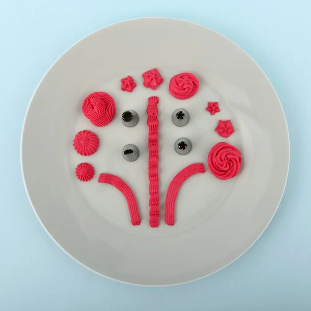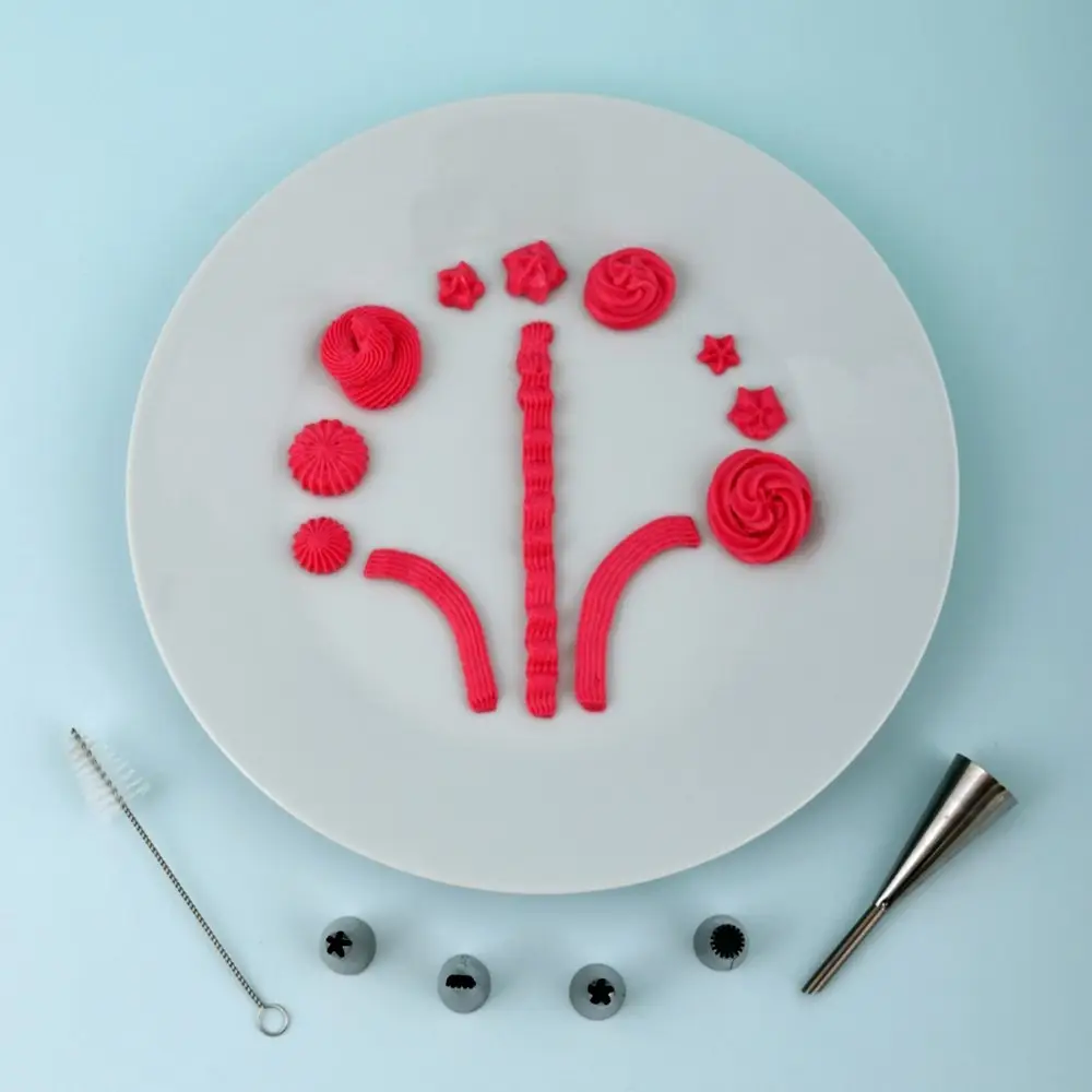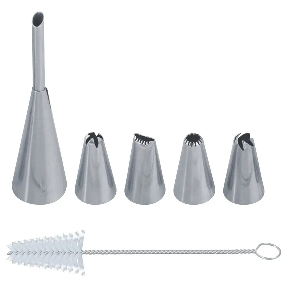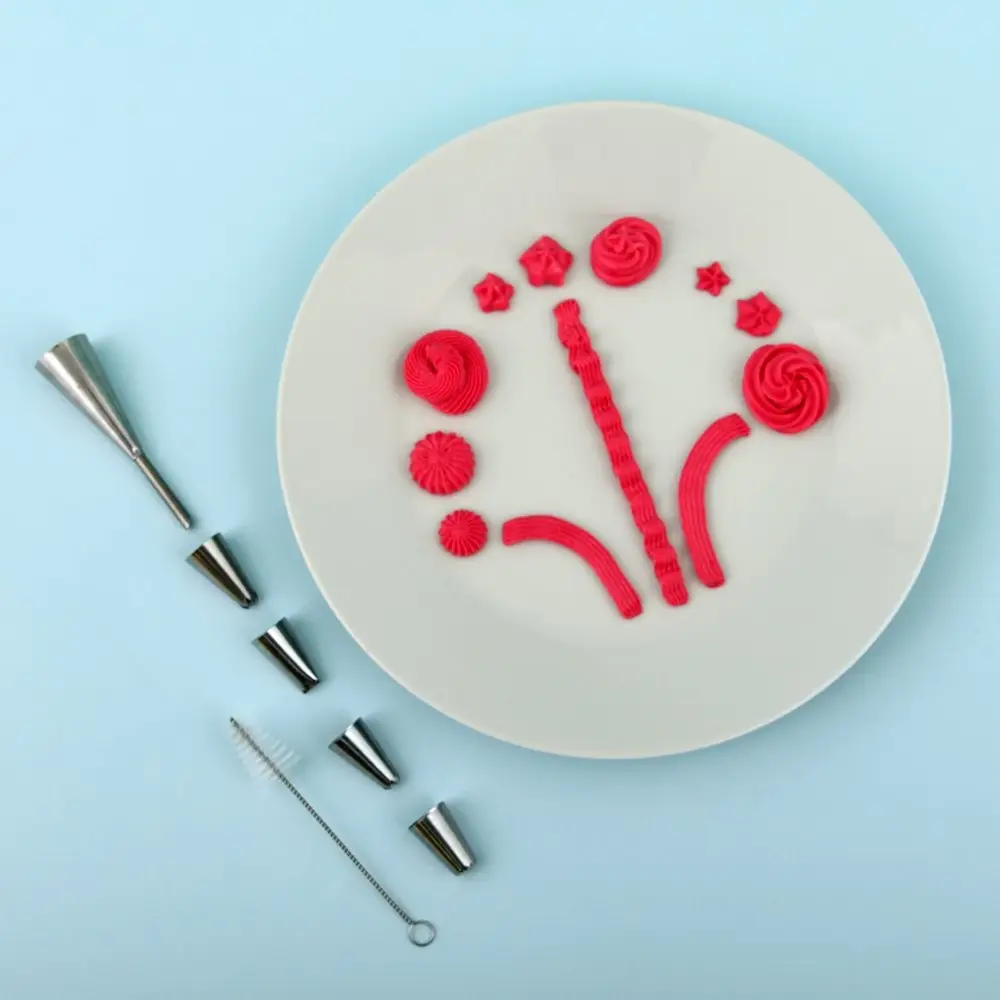 В набор входит 5 кондитерских насадок и ершик для их очистки. С помощью этих этих приспособлений можно создавать оригинальные рисунки на тортах, пирожных и печеньях.
