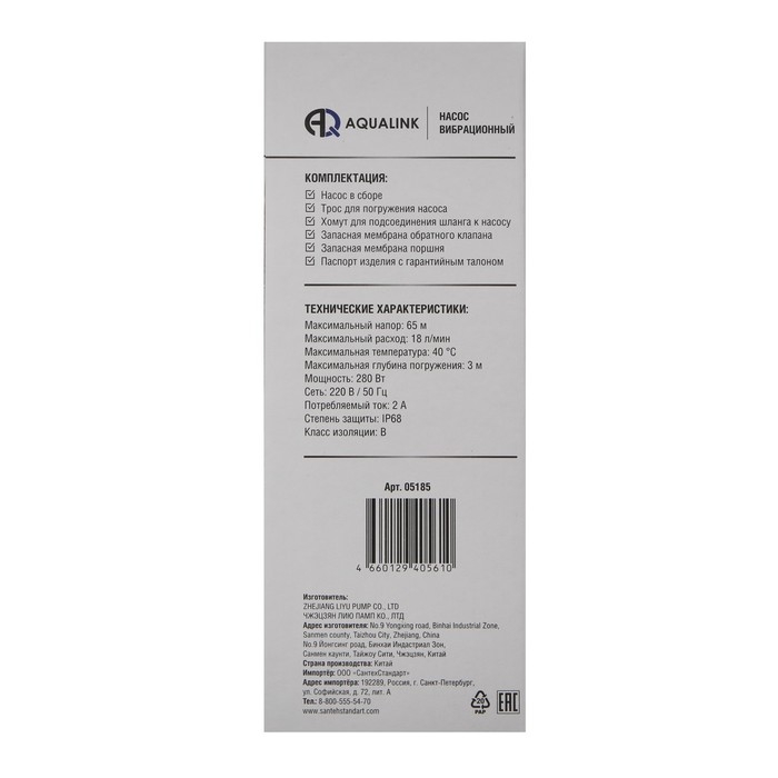 Насос вибрационный AQUALINK VP D-65/18-10, 280 Вт, нижний забор, 18 л/мин, напор 65 м, 10 м