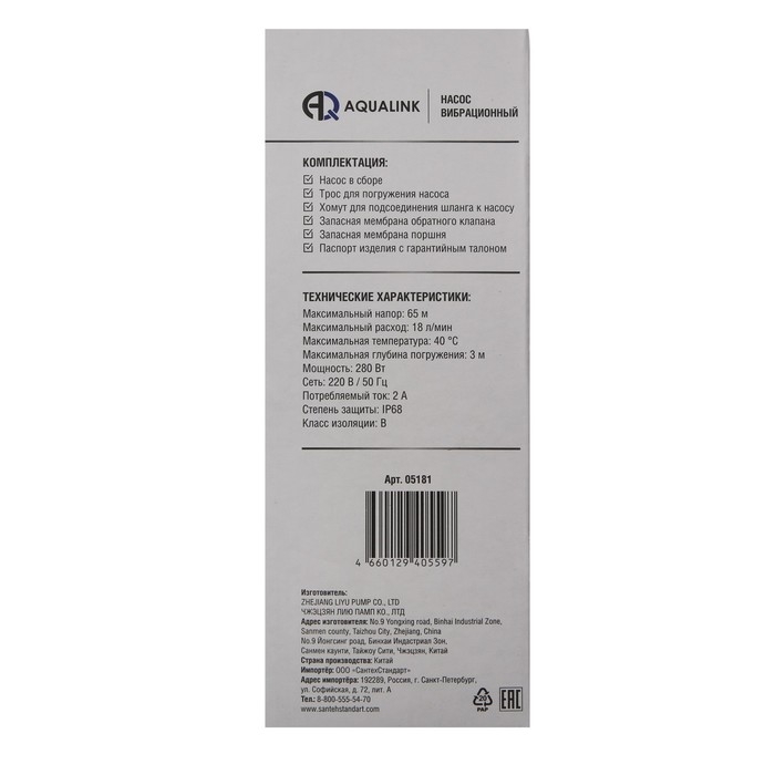 Насос вибрационный AQUALINK VP U-65/18-16, 280 Вт, верхний забор, 18 л/мин, напор 65 м, 16 м