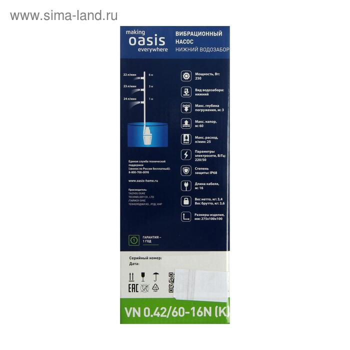 Насос вибрационный Oasis VN 0.42/60 - 16N, нижний забор, напор 60 м, 25 л/мин, 16 м