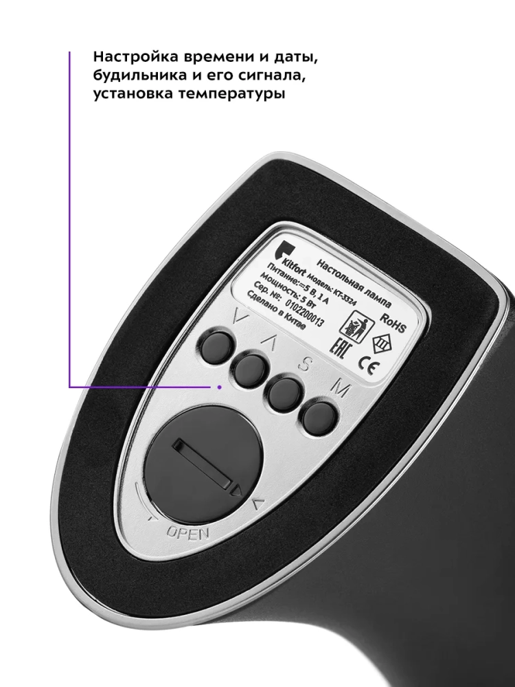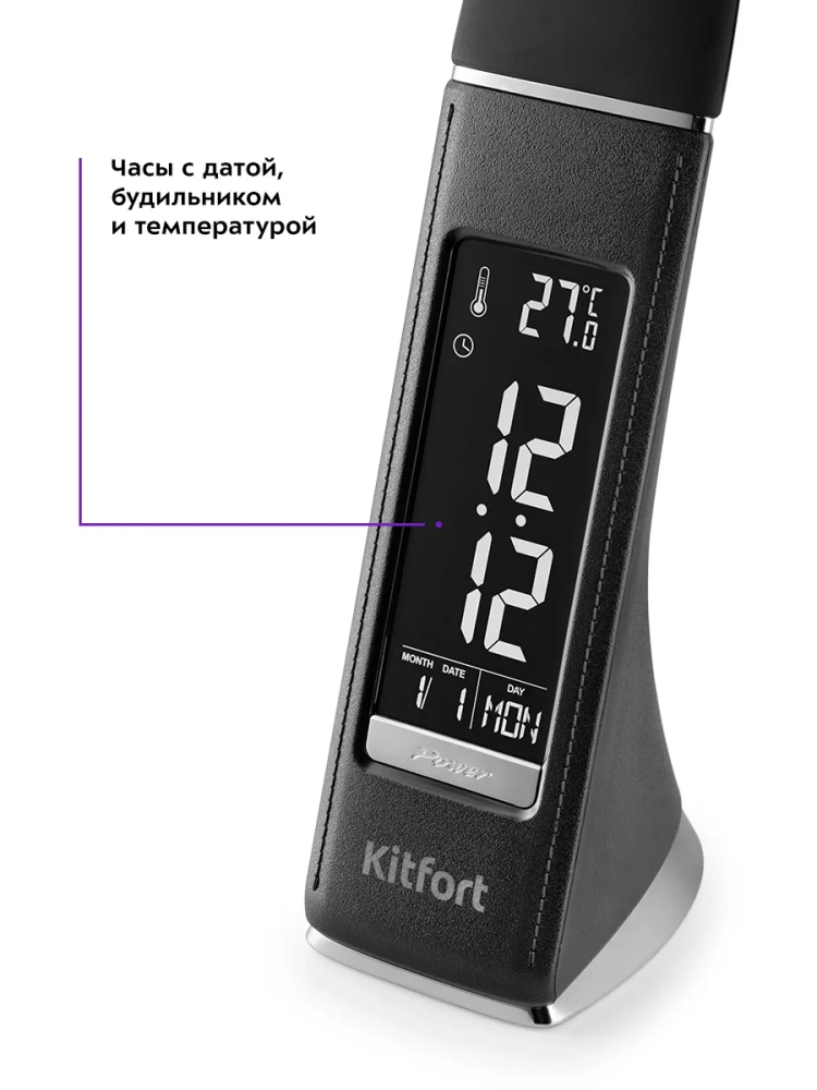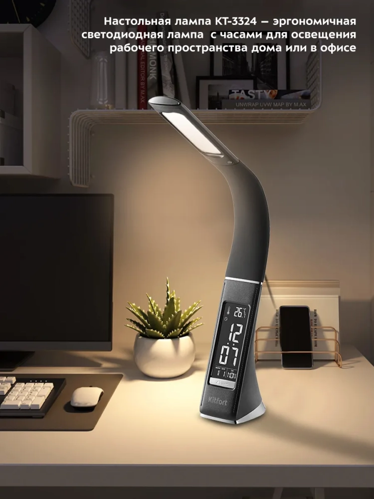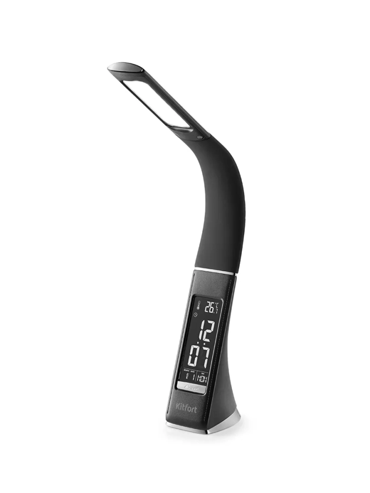 Настольная лампа Kitfort КТ-3324 - эргономичная светодиодная лампа с часами, которая отлично подойдет для освещения рабочего пространства дома или в офисе. Преимущества светодиодных ламп в отличие от ламп накаливания (ЛН) и компактных люминесцентных ламп (КЛЛ): • безопасность: лампы практически не нагреваются в процессе работы как ЛН, риск получения ожога сведен к минимуму; светодиодные лампы не содержат пары ртути как КЛЛ; • долговечность светодиодов составляет 30000 часов (до 30% снижения яркости); • высокое качество освещения: индекс цветопередачи (Ra>80).При помощи индекса цветопередачи можно определить, насколько точно при искусственном освещении передается естественный цвет окружающей среды. Спектр излучения КЛЛ - линейчатый, а ЛН и светодиодных ламп - непрерывный, что способствует меньшему искажению света. Одной из характеристик источников света является цветовая температура. Цветовая температура (измеряется в градусах Кельвина, К) источника света характеризует спектральный состав излучения источника света и является основой объективности впечатления от цвета отражающих объектов и источников света. В искусственном освещении понятие цветовой температуры привязано к источникам белого света и находится в диапазоне 1000-10000 К. Проще говоря, под цветовой температурой мы понимаем насколько желтый или синий оттенок белого света имеет тот или иной источник света в зависимости от значения в градусах Кельвина. За нейтральную цветовую температуру принято считать диапазон 4000-5000 К, теплый свет - 2000-3500 К и холодный - 5200-10000 К.КТ-3324 работает в режиме холодного света (5500 К ±10%). Холодный свет рекомендуется использовать в рабочих зонах. Больше всего такое освещение подходит для офисов, аудиторий, медицинских и учебных учреждений, так как в этих помещениях важно не искажать восприятие цветов и отдельных элементов. Согласно ГОСТ Р 55710-2013, цветовая температура источника света на рабочем месте должна быть в диапазоне 4000-6500 К. Для поддержания комфорта глаз при работе в любое время вы можете воспользоваться дополнительным источником света, например, светодиодной настольной ламой. В лампе есть часы с датой и будильником, а также на дисплее отображается температура в комнате. Мощность - 5 Вт. Средний срок службы - 30 000 ч (до 30% снижения яркости светодиодов). Количество светодиодов - 25. Количество режимов работы - 3. Освещенность - 1500 Лк. Температура цвета - 5500 К+-10%. Встроенный диммер - да. Количество мелодий будильника - 8.