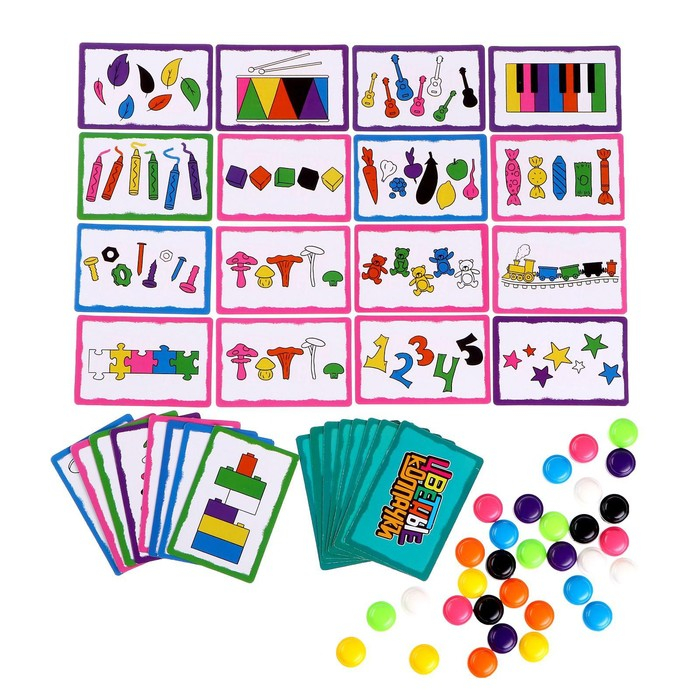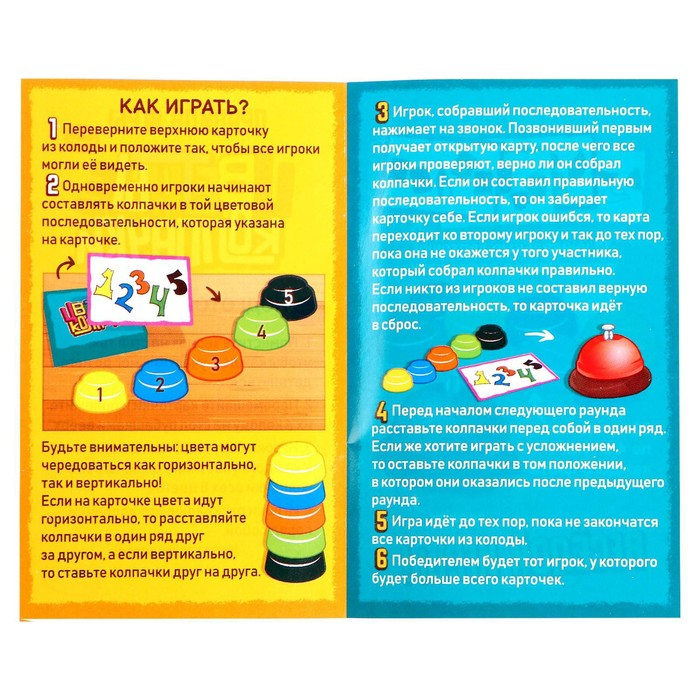 Нужно собрать 5 колпачков в том порядке, как изображено на открытой карточке, и позвонить в звоночек раньше соперников.