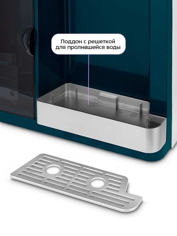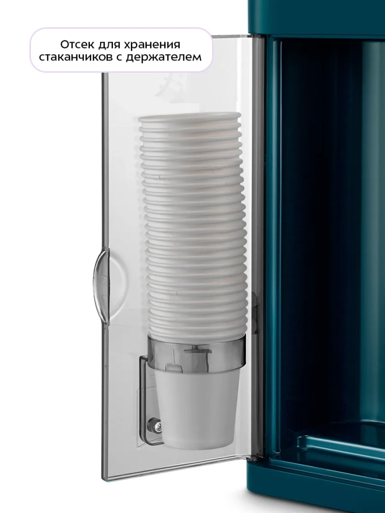 У кулера есть удобный отсек, в котором можно хранить бумажные или пластиковые стаканчики. На дверце отсека с внутренней стороны установлен специальный держатель для стаканчиков, из которого удобно взять одноразовый стаканчик и, не отходя от кулера, сразу наполнить его чистой питьевой водой. Поскольку отсек закрыт дверцей, пыль не будет попадать на стаканчики.