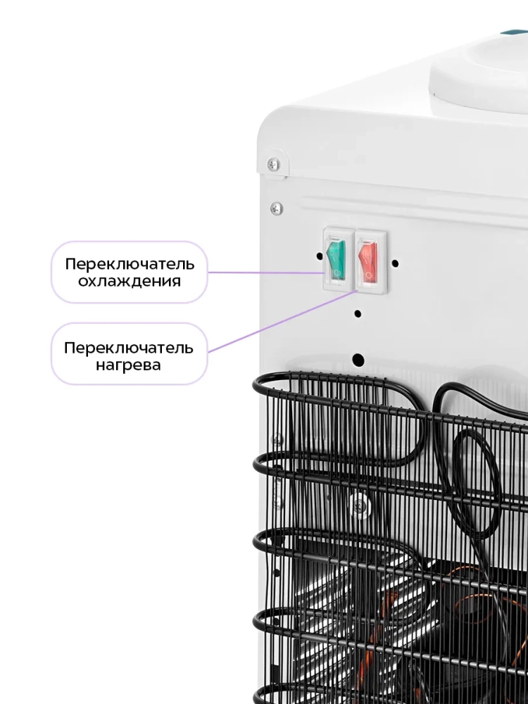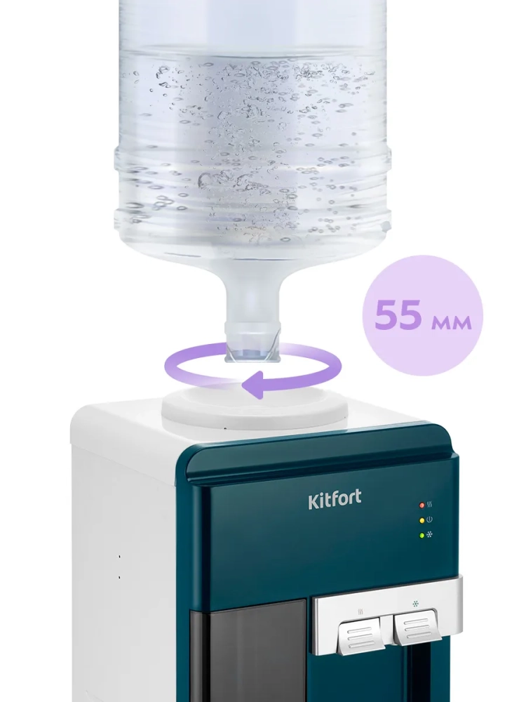 Для кулера КТ-6731 подходят 19-литровые бутыли с диаметром горлышка 55 мм. Бутыль с питьевой водой устанавливается сверху в бутылеприемник. Вода сначала попадает в резервуар для холодной воды, оттуда часть воды переходит в резервуар для горячей воды. В резервуарах вода охлаждается и нагревается до определенной температуры.
