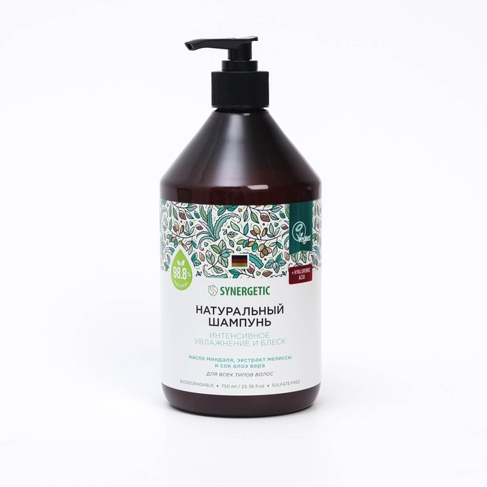 Натуральный бессульфатный шампунь SYNERGETIC "Интенсивное увлажнение и блеск" - эффективное средство для очищения кожи головы и всех типов волос. Шампунь обеспечивает деликатное очищение, эффективный уход за волосами и защиту кожу головы. Формула с гиалуроновой кислотой оказывает комплексное воздействие, эффективно увлажняет волосы и придает им здоровое сияние, не утяжеляя их. Комплекс масел миндаля, арганы и конопли оказывает восстанавливающее действие. Инновационные компоненты шампуня укрепляют волосы и стимулируют восстановление кератиновых волокон. Сок алоэ вера и экстракт мелиссы придают волосам эластичность и блеск. Мультифункциональный компонент натурального происхождения софоролипид мягко очищает кожу головы и сохраняет естественный микробиом. Нанести небольшое количество шампуня на влажные волосы, хорошо вспенить и тщательно смыть водой. При необходимости повторить процедуру. Возможно появление естественного осадка натурального происхождения и незначительное изменение цвета шампуня, не влияющие на его качество и свойства. Только для наружного применения. Беречь от детей. При попадании средства в глаза промыть водой. Использовать строго по назначению. Aqua, Glycerin, Cetearyl Alcohol, Potassium Cetyl Phosphate, Butyrospermum Parkii Butter, Glyceryl Stearate, Cocos Nucifera Oil, Caprylic/Capric Triglyceride, Coco-Caprylate/Caprate, Isoamyl Laurate, Stearic Acid, Palmitic Acid, Caffeine, Theobroma Cacao Seed Butter, Citrus Grandis Fruit Extract, Coffea Arabica Seed Extract, Caprylyl Glycol, Propanediol, Niacinamide, Tocopheryl Acetate, Trehalose, Saccharide Isomerate, Citric Acid, Sodium Citrate, Polyglyceryl-10 Laurate, Xanthan Gum, Parfum, Potassium Hydroxide, Benzoic Аcid, Sodium Benzoate, Potassium Sorbate.