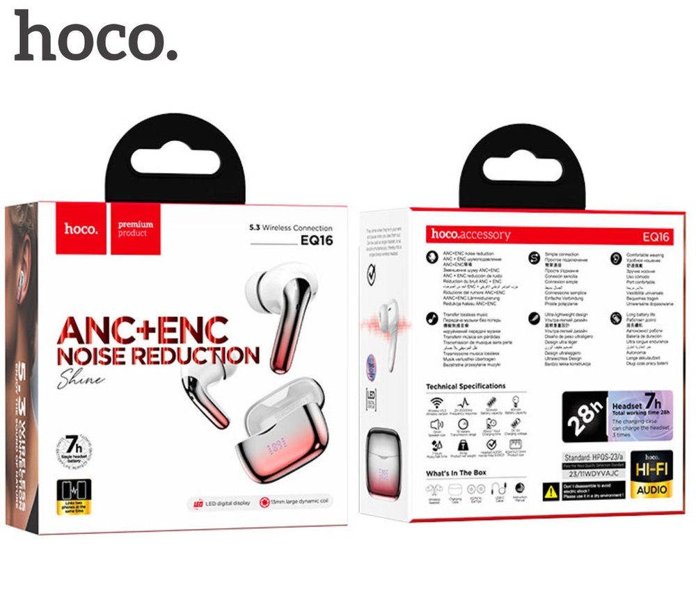 Беспроводные наушники Hoco EQ16 – это одна из последних разработок нового поколения с превосходным громким звуком, качественным микрофоном и глубокими басами. EQ16 - устройство закрытого или вакуумного типа, это значит, что они полностью перекрывают ушной канал и частично заглушают внешние шумы даже при выключенном шумоподавлении. У Hoco EQ16 есть режим активного шумоподавления и режим прозрачности. При включенном активном шумоподавлении дополнительно снижается уровень внешних шумов. При включенном режиме прозрачности уровень внешних шумов возрастает, до такого уровня, как будто у вас в ушах нет наушников. У Hoco EQ16 великолепное качество звука, благодаря динамику 13 мм. Можно подключать сразу к двум устройствам. Наушники отлично подходят для разговоров по телефону. Собеседники будут вас прекрасно слышать. Время работы в режиме прослушивания музыки без подзарядки от кейса до 7 часов. На зарядном кейсе расположен цифровой дисплей, показывающий уровень заряда кейса и наушников. Сенсор управления гарнитурой расположен в верхней части наушников. Это очень удобно, можно брать наушник за ножку и не бояться, что сработает сенсор. В комплекте идут несколько размеров сменных амбушюр, можно подобрать подходящий размер и тем самым обеспечить максимальный комфорт при вкладывании наушника в ухо. На кейсе расположен разъем Type-C для зарядного кабеля, который также идет в комплекте.
