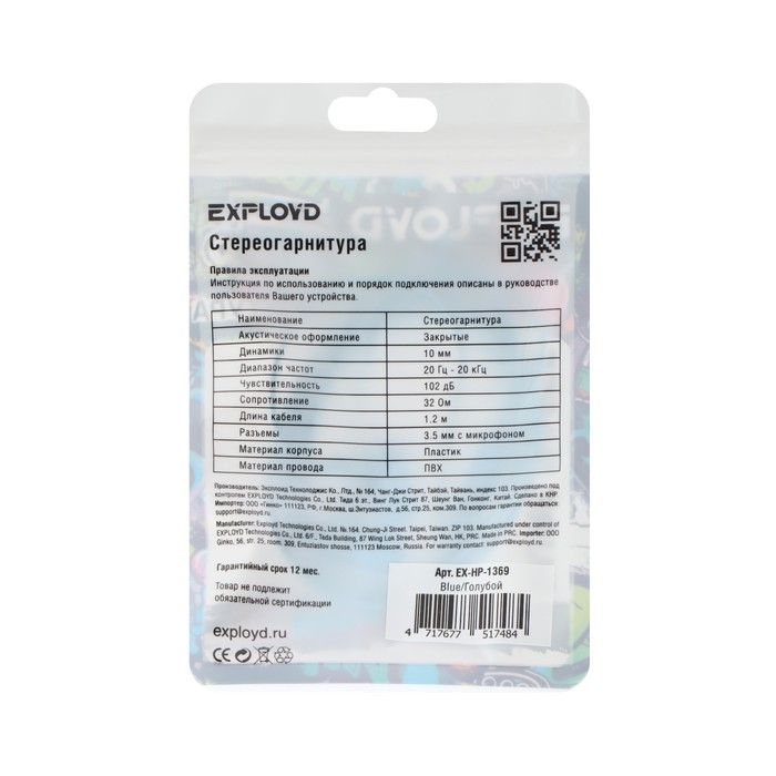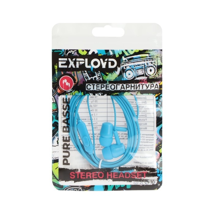 Наушники Exployd EX-HP-1369, вакуумные, микрофон, 102 дБ, 32 Ом, 3.5 мм, 1.2 м, голубые