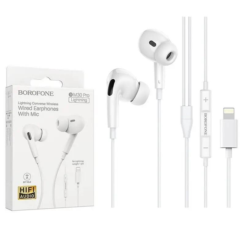 Вакуумные наушники для iphone с микрофоном Borofone BM30 Pro предназначены для обеспечения удобства, комфорта и мобильности своих обладателей. Данная модель выполнена в аккуратном дизайне, оснащена микрофоном с отличной передачей речи и многофункциональной кнопкой-регулятором, позволяющей управлять громкостью. Встроенный микрофон позволяет говорить по телефону и обмениваться голосовыми сообщениями. Собеседник будет прекрасно вас слышать. Устройство очень удобно сидит в ухе не причиняя дискомфорт. Такие спортивные наушники являются отличным вариантом для людей, которые ведут активный образ жизни, ведь амбушюры плотно крепятся в ухе и не выпадают даже при занятии спортом или другой деятельности. Вы можете слушать музыку или аудиокниги и одновременно заниматься домашними делами. Товар прекрасно подойдёт в подарок для ребенка, подруге, коллеге. Данная гарнитура подходит как к смартфонам, так и к телефонам и планшетам Apple: IPhone IPad IPod (плеер). Наушники капельки подходят для большинства моделей айфон с разъемом Lightning. В результате вы получите громкое и насыщенное звучание, которое исключает посторонние звуки.