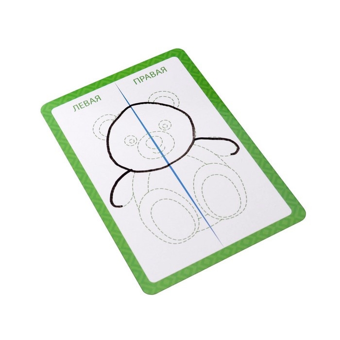 Учимся рисовать двумя руками Внутри вас ждёт 20 двухсторонних карточек, в которых нужно рисовать обеими руками сразу. На одной стороне карт находятся изображения, разделённые пополам. Левую половинку нужно рисовать левой рукой, а правую — правой. И всё это одновременно! На другой стороне карт ребёнку необходимо, не отрывая маркеры от карточки, провести линии обеими руками. Это поможет синхронизировать работу обоих полушарий мозга. Все карточки многоразовые. Стереть рисунок легко с помощью сухой салфетки или обратной стороной маркера. Польза игры Развивает оба полушария мозга. Тренирует моторику рук. Готовит руки к письму. Внутри вы найдёте 20 двухсторонних карт. 2 маркера. Развиваем оба полушария! Размер (Д × Ш × В, см) 17 х 11,5 х 2 Вес брутто 127 г