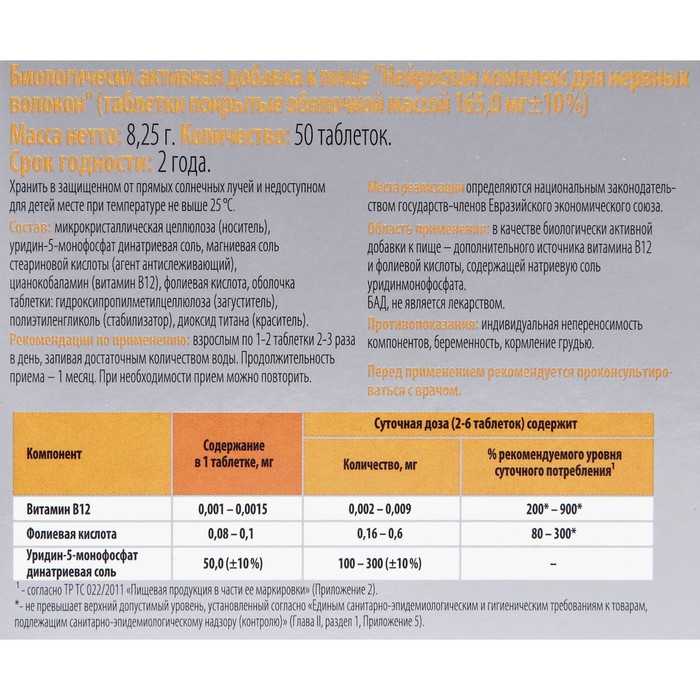 Показания к применению: Рекомендуется в качестве дополнительного источника витамина В12, фолиевой кислоты, содержащей натриевую соль уридинмонофосфата
