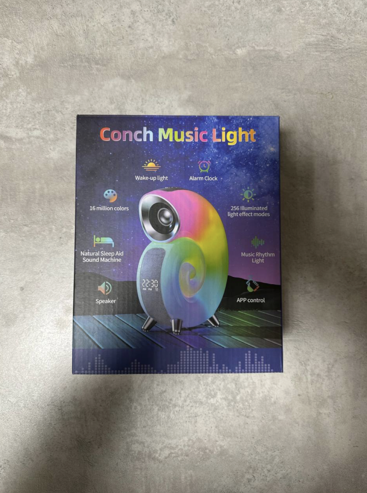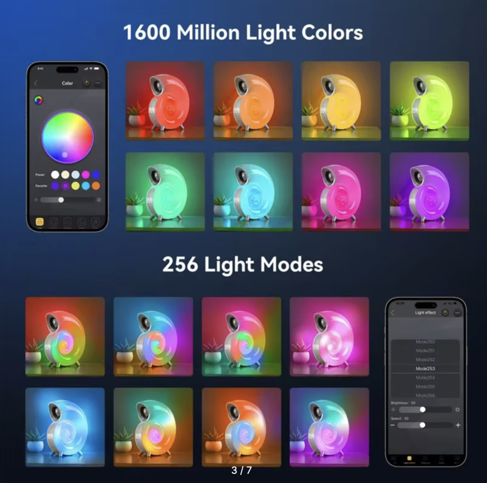 Основные функции ночника: цветная и белая подсветка с управлением со смартфона, встроенная bluetooth колонка, встроенный аккумулятор, 8 встроенных природных мелодий, умные часы будильник.