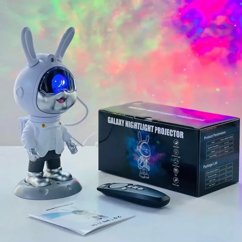 Ночник-проектор звёздное небо «Космонавт-Кролик» позволяет создать спокойную и уютную атмосферу в любой комнате дома: спальне, гостиной, детской, ванной. Особенности устройства: имеет подсветку в виде ночного неба, луны, туманности, звёзд, космоса; простое и понятное управление с помощью пульта дистанционного управления; можно регулировать 8 режимов и яркость света; площадь освещения 25 кв. м; можно использовать как помощника для безопасного и крепкого сна ребёнка любого возраста. Комплектация: ночник, пульт ДУ, USB-кабель, руководство по эксплуатации.