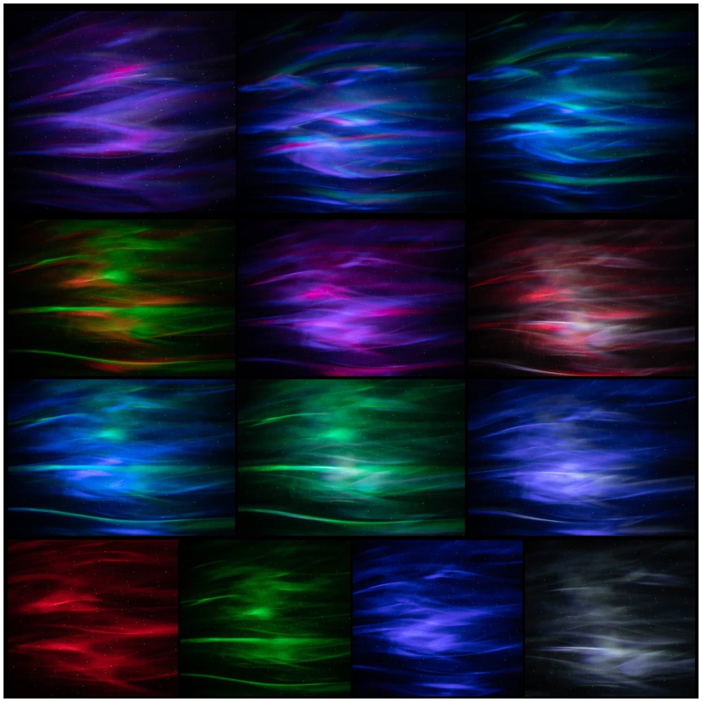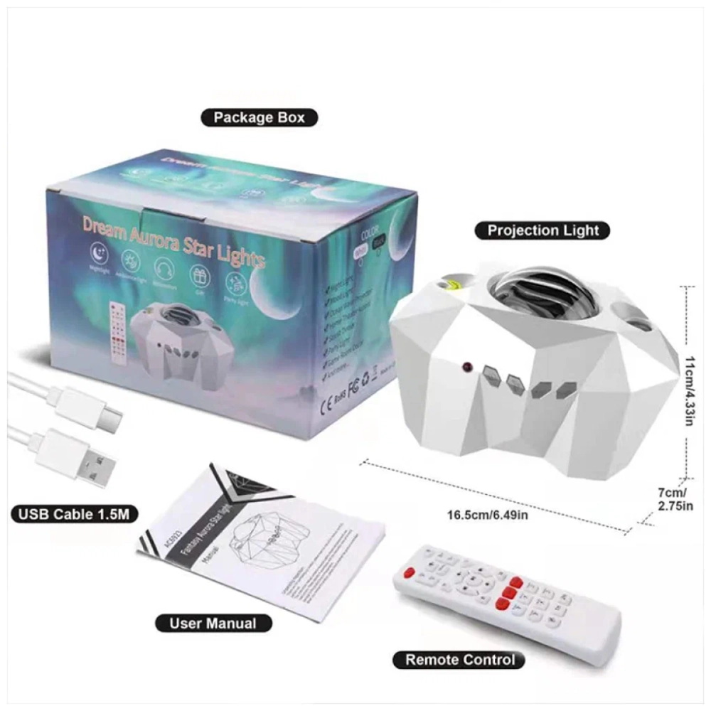 Детский светильник ночник с проекцией северного сияния и луны. Из 4 цветов образуется 6 режимов освещения: проецируйте свою собственную галактику с помощью ночника звездное небо.