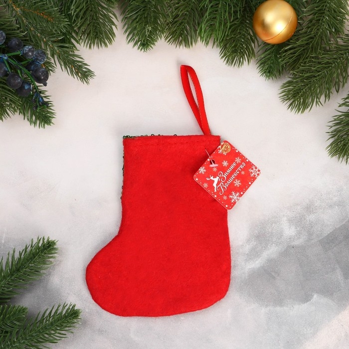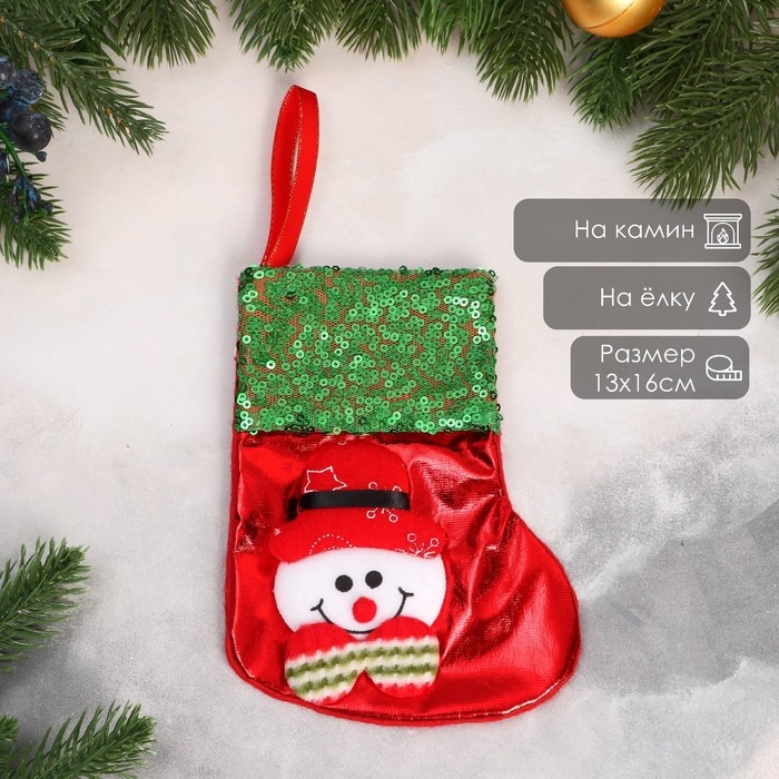 Носок для подарков "Снеговик блеск, снежинка" 13х16 см, красно-зелёный