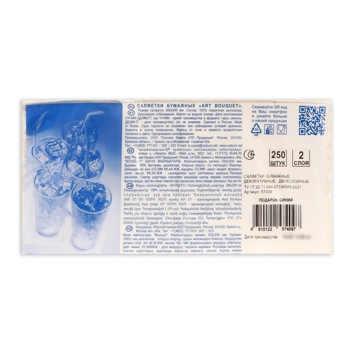 Салфетки бумажные Art Bouquet «Подарок синий» — это двухслойные салфетки размером 20х20 см, которые станут прекрасным дополнением к вашему столу или интерьеру. Они изготовлены из высококачественной целлюлозы и красок на водной основе, что гарантирует их экологичность и безопасность для здоровья.