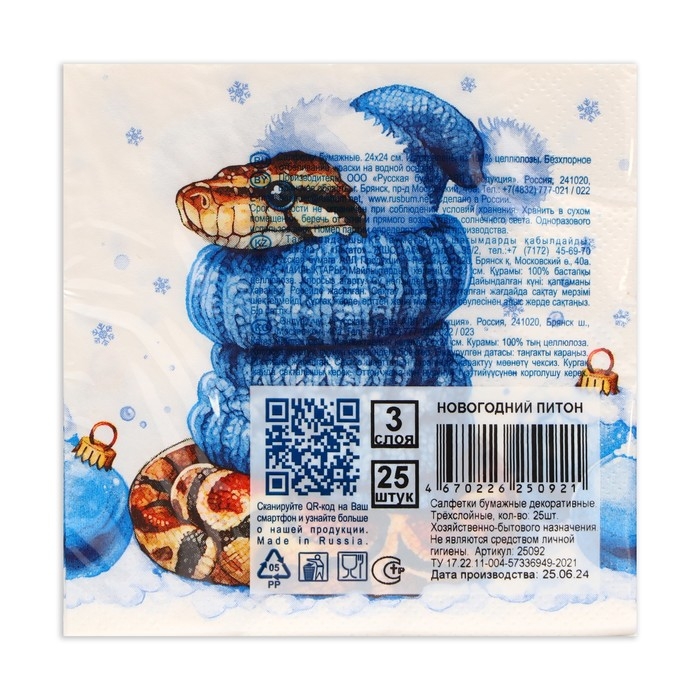 Новогодние салфетки бумажные Bouquet de Luxe «Новогодний питон», 3 слоя, 24х24 см, 25 шт.