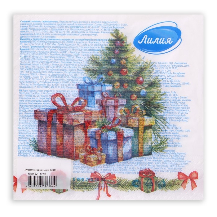 Новогодние салфетки бумажные Лилия «Новогодние подарки», 2 слоя, 33х33 см, 20 шт
