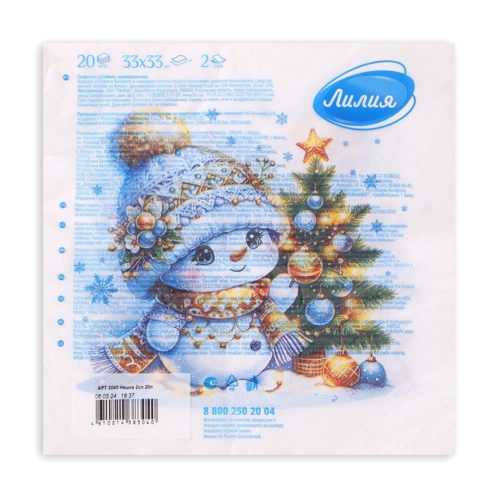 Новогодние салфетки бумажные Лилия «Няшка», 2 слоя, 33х33 см, 20 шт
