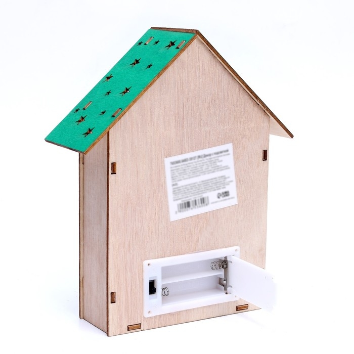 Изделие выполнено из экологичного материала — дерева и работает от батареек.