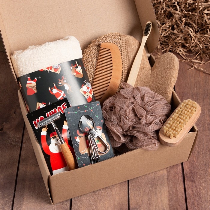 Брелок, Бритвенный станок, Варежка-мочалка, Зубная щётка, Мочалка, Полотенце, Расчёска для волос, Щётка