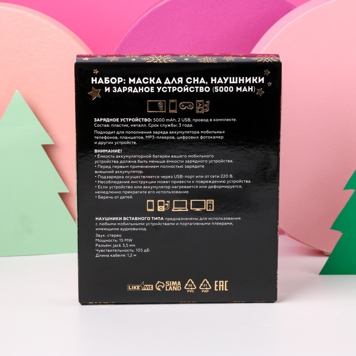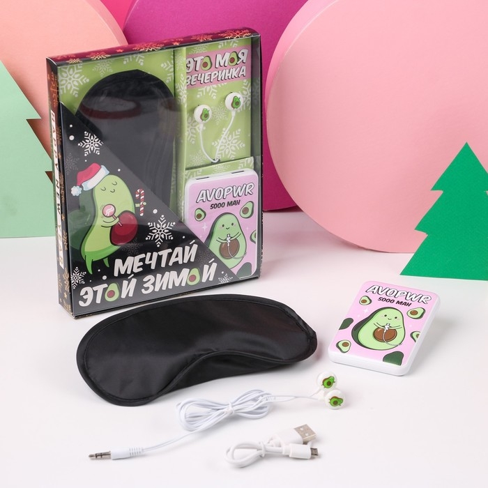 Новогодний подарочный набор,проводные наушники, маска для сна и зарядное устройство (5000 mAh) «Новый год: Мечтай»