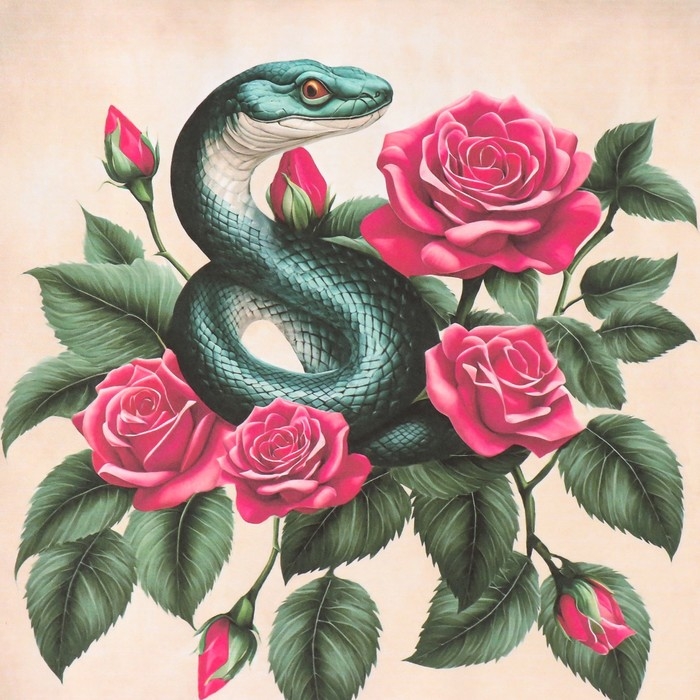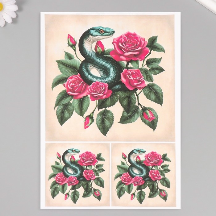 Новогодняя декупажная карта "Змея в розах", плотность 45 г/м2, формат А4