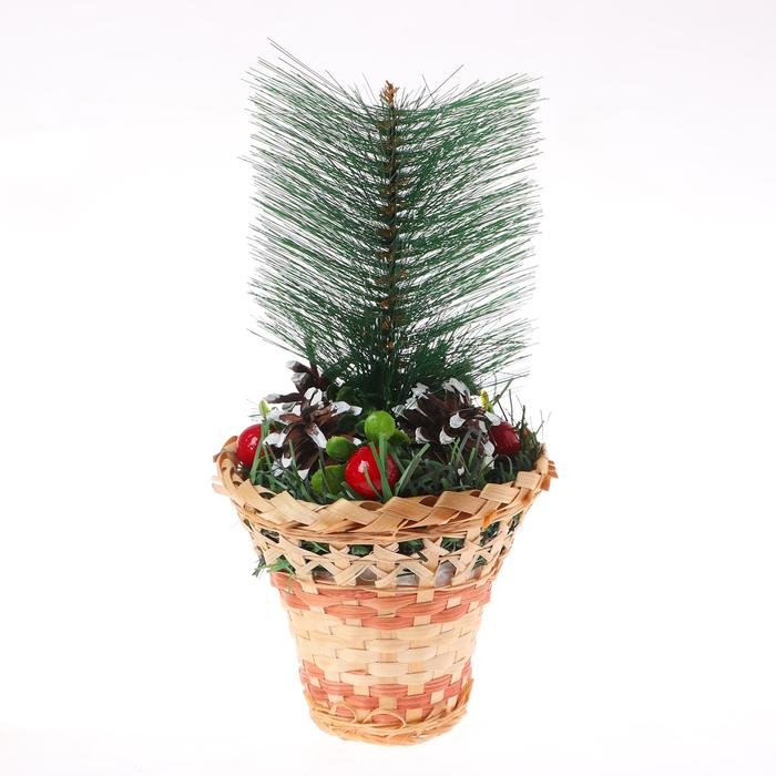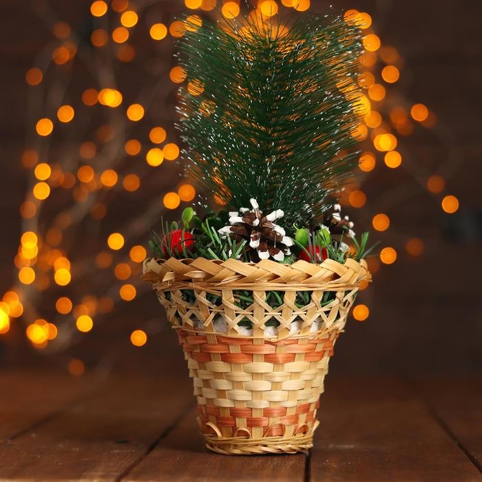 Сочетание зелени, шишек и корзинки создаёт праздничное настроение и привлекает внимание своей натуральной простотой. Прекрасный выбор для украшения интерьера к Новому году или в качестве подарка.