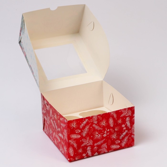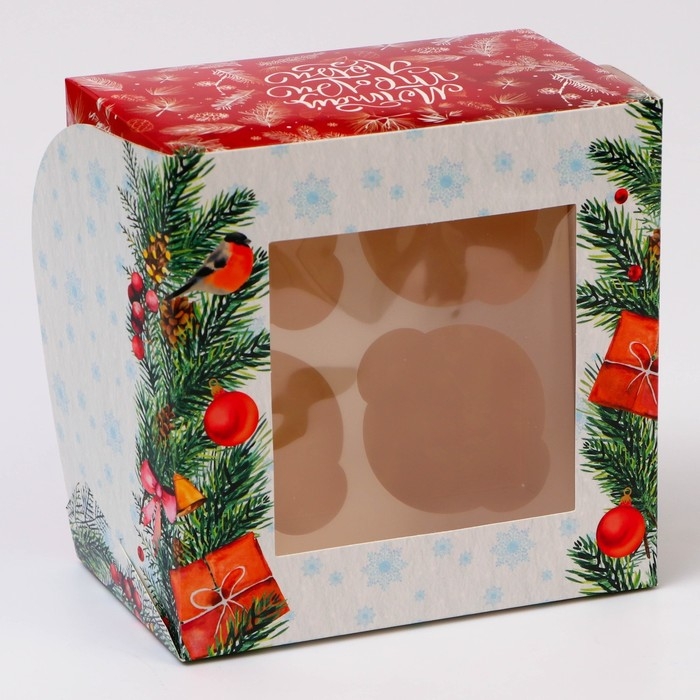 Новый год. Коробка для 4 капкейка с окном "Новогодние подарки", 16 х 16 х 10 см, упаковка