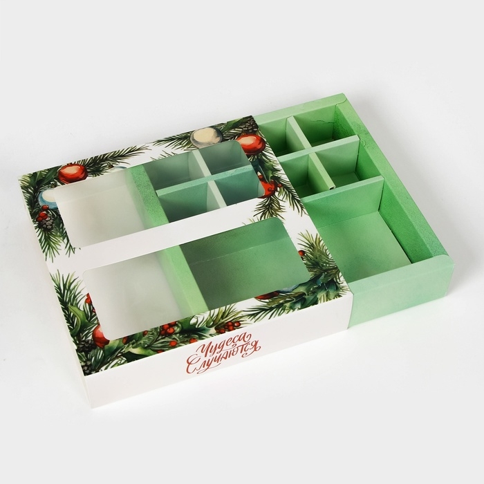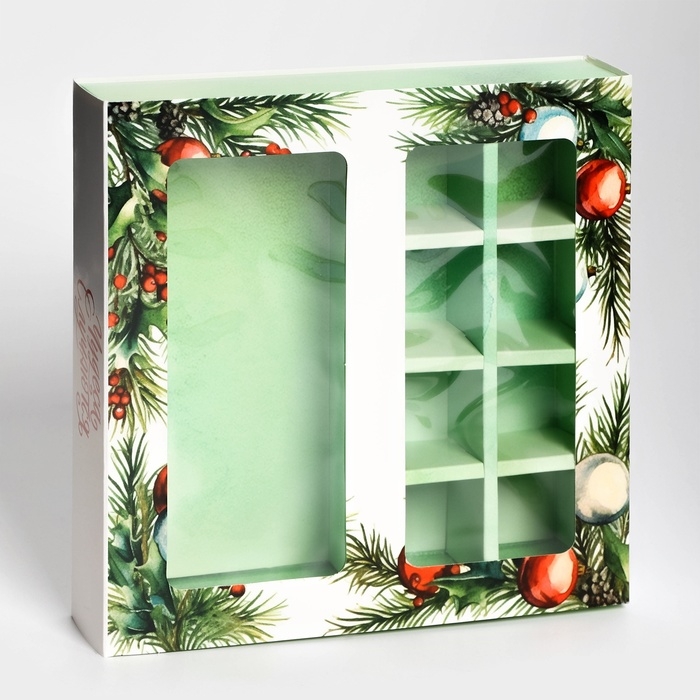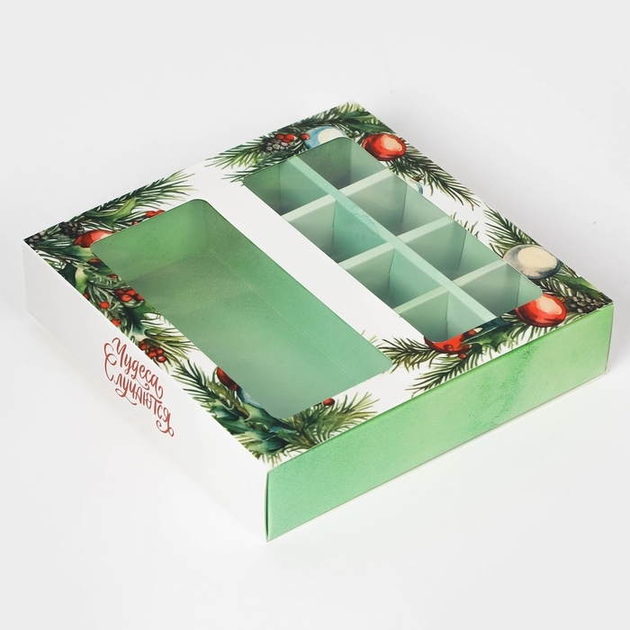 Новый год. Коробка под 8 конфет и шоколад, с окном "Чудеса случаются", 17,7 х 17,8 х 3,8 см, кондитерская упаковка