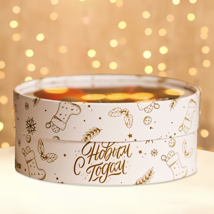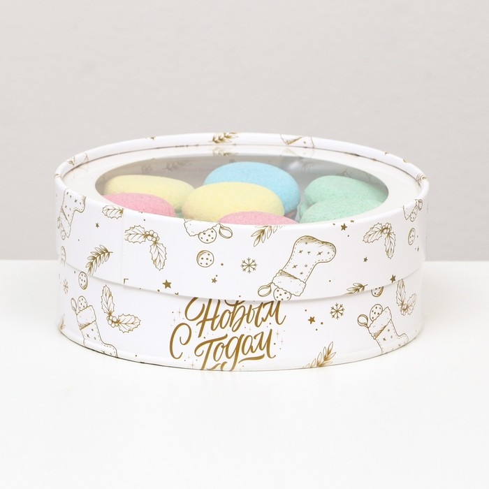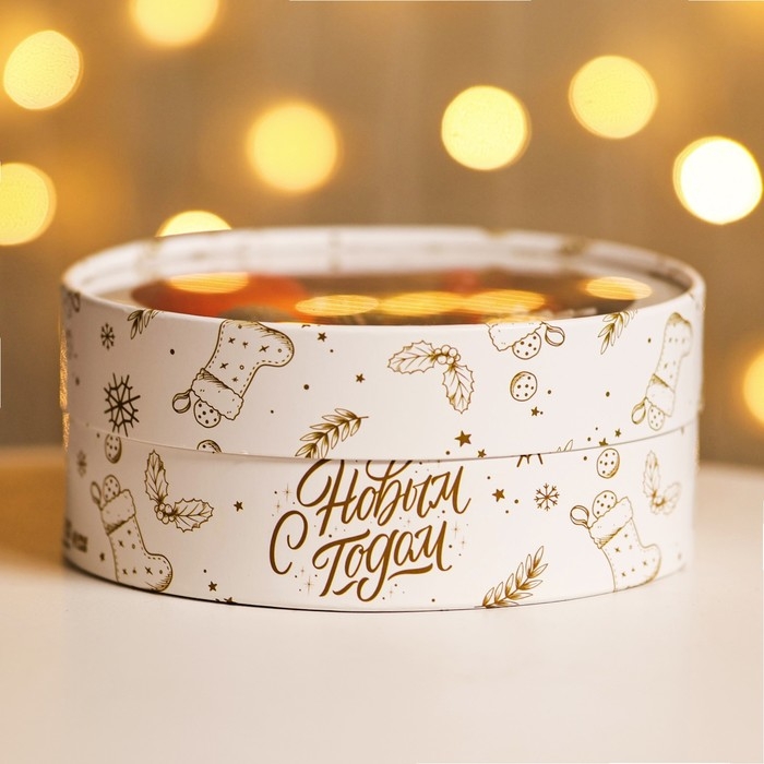 Новый год. Коробка подарочная новогодняя для макарун тубус с окном "С Новым годом" 18 х 18 х 6 см.