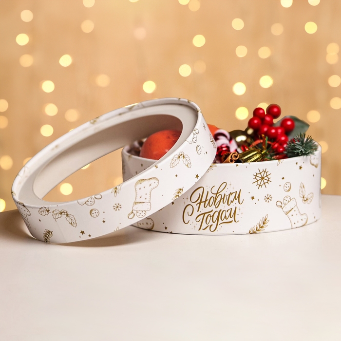 Новый год. Коробка подарочная новогодняя для макарун тубус с окном "Новогодний подарок" 21 х 21 х 8 см.