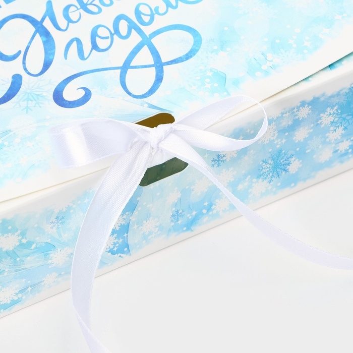 Изготовленная из прочного картона, коробка обеспечивает надежную защиту содержимого и легко складывается, что упрощает хранение и транспортировку. Яркий новогодний дизайн с праздничными элементами создает атмосферу волшебства и радости, а мягкая лента на крышке добавляет дополнительный элемент изысканности и завершенности.
