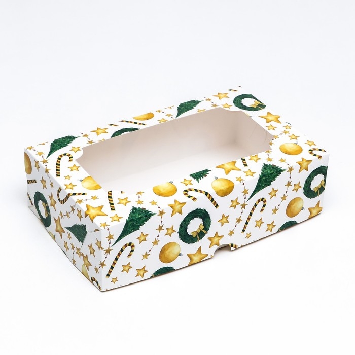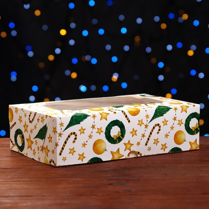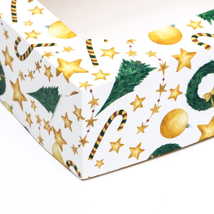 Новый год. Коробка складная, кондитерская упаковка с окном "Звезды и трости", 25 х 15 х 7 см