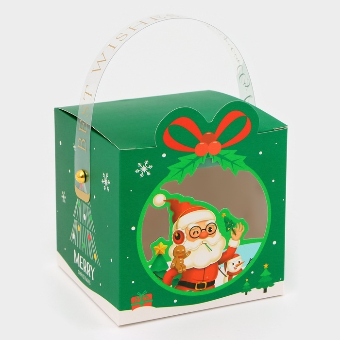 Новый год. Коробка складная с окном Новогодняя зеленая 10 х 10 х 12 см.