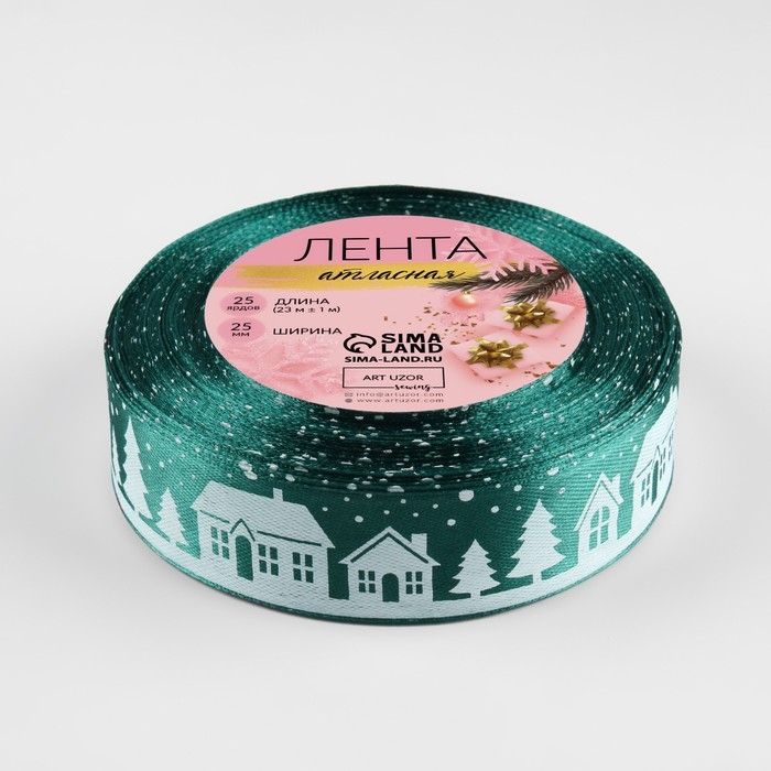 Новый год! Лента атласная «Домики», 25 мм, 23 ± 1 м, цвет зелёный №56
