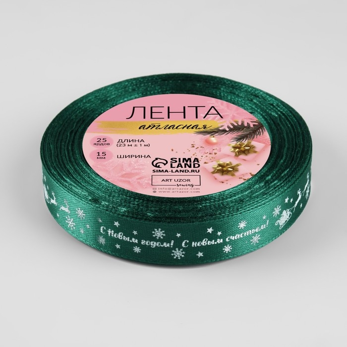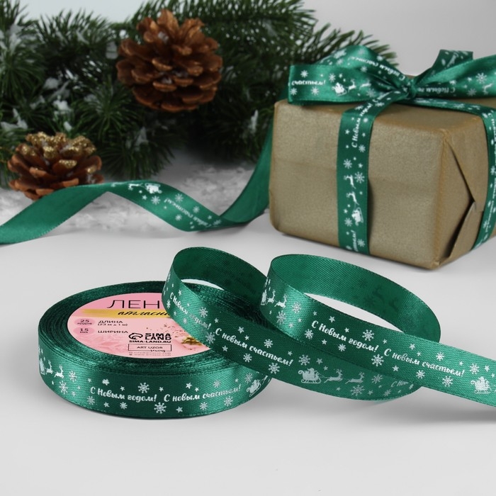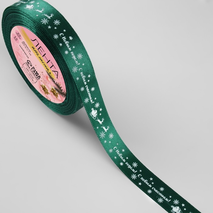 Новый год! Лента атласная «С Новым годом», 15 мм, 23 ± 1 м, цвет зелёный №56