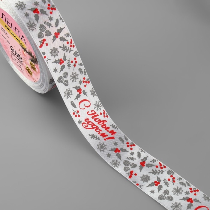Новый год! Лента атласная «С Новым годом!», 25 мм, 23 ± 1 м, цвет белый/красный №001