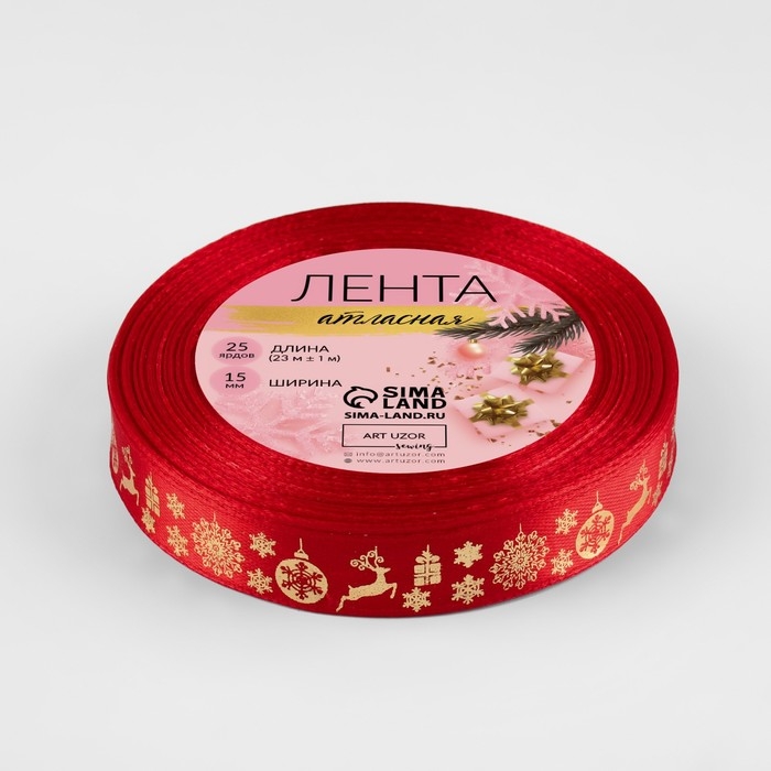 Новый год! Лента атласная с тиснением «Олени», 15 мм, 23 ± 1 м, цвет красный/золотой №026