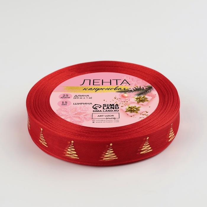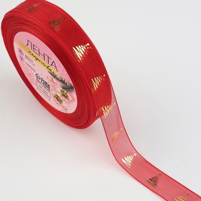 Новый год! Лента капроновая с тиснением «Ёлки», 15 мм × 23 ± 1 м, цвет красный/золотой