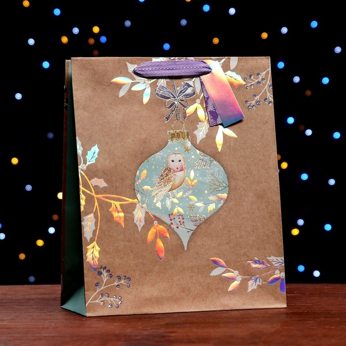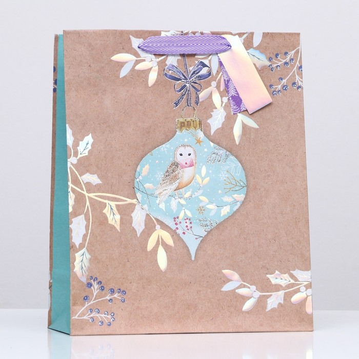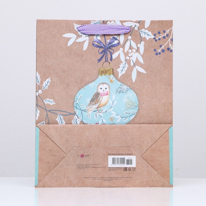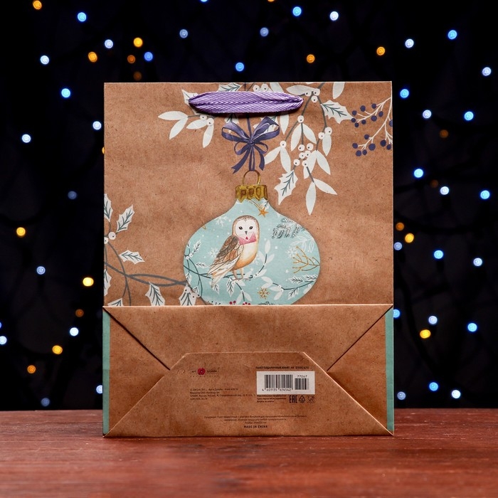 Новый год. Пакет бумажный подарочный новогодний крафт "Сова" 26 х 32 х 12 см.