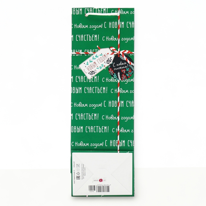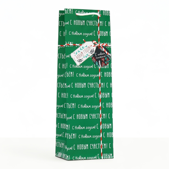 Новый год. Пакет подарочный "Надписи", зеленый, 12 х 36 х 8,5 см.