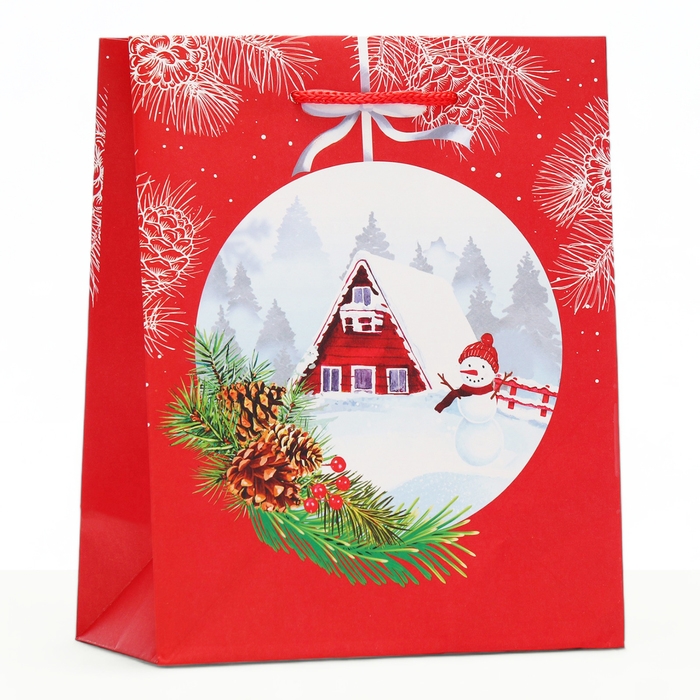 Пакет подарочный новогодний изготовлен из прочного и качественного материала, включая картон, текстиль и высококачественную бумагу.
